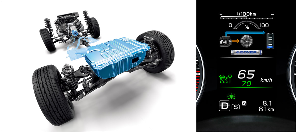 Za efikasnu vožnju, SUBARU e-BOKSER sistem prilagođava odnos raspodjele snage između namjenskog 2,0-litarskog motora sa direktnim ubrizgavanjem i električni motor kako bi odgovorio uslovima vožnje. U kombinaciji sa Lineartronic, rezultat je tiho, glatko i snažno izvođenje za udobnu i ugodnu vožnju u mnogim situacijama. Štaviše, uzdužni položaj motora i baterije duž centralne linije vozila dopunjuje stabilnost vozila i ravnotežu koju dobija od niskog centra gravitacije SUBARU BOKSER motora i inherentno stabilnog simetričnog AWD dizajna.